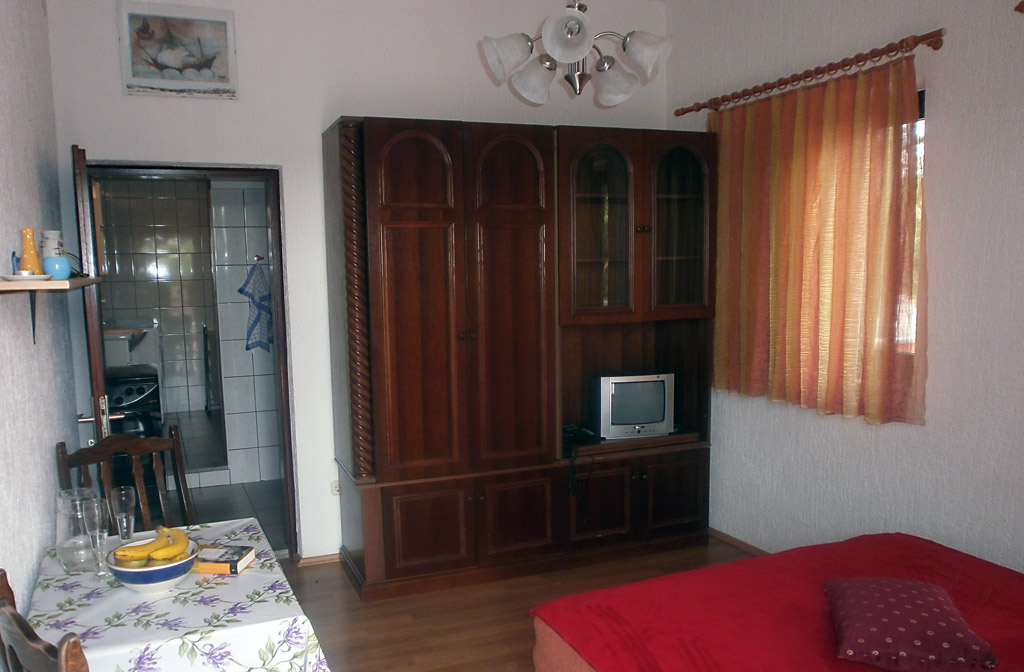 -pov. 25 m2, bračni krevet u sobi koja je ujedno i dnevna soba, kuhinja, kupaona, TV, klima, terasa s pogledom na more |